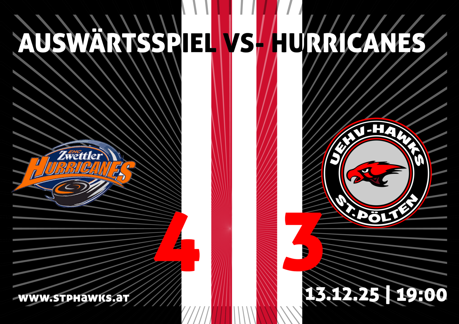 Was für ein Abend am Zwettler Eislaufplatz. Die Hawks zeigten über weite Strecken ein starkes Auswärtsspiel, mussten sich aber nach großem Kampf knapp mit 3:4 geschlagen geben. Trotz der Niederlage konnte das Team von Headcoach Patrick Backknecht‑Deutsch stolz auf seine Leistung sein, lange Zeit hatte man das Geschehen fest im Griff.